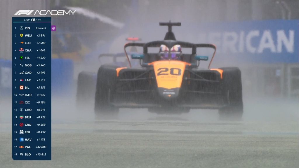 En la vuelta 13, Weug decidía quedarse en pista para no perder posiciones al entrar a boxes. Al mismo tiempo, el safety car se retiraba, lo que daba paso a una “sprint” de una sola vuelta. Weug aprovechó esa última vuelta para atacar a Pin y consiguió arrebatarle la posición, proclamándose líder de la carrera en el último momento. Doriane Pin finalizó segunda, sumando además un punto extra por la vuelta rápida, mientras que Ella Lloyd completó el podio.