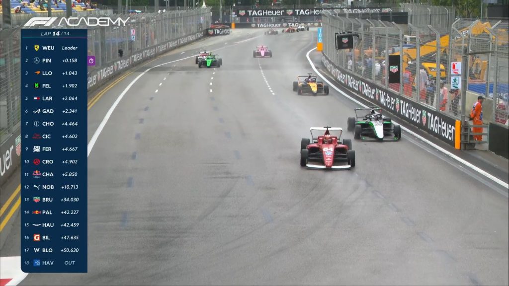 Llega la segunda cita de la F1 Academy en Singapur, después de una impecable carrera de Lia Block, quien se llevo la victoria en la anterior ronda. Sin embargo, esta vez no tendría la misma suerte ya que partía desde la última posición en parrilla. Al inicio de esta encontrábamos a Maya Weug con la pole, la seguían Doriane Pin y cerraba el podio Chloe Chambers.