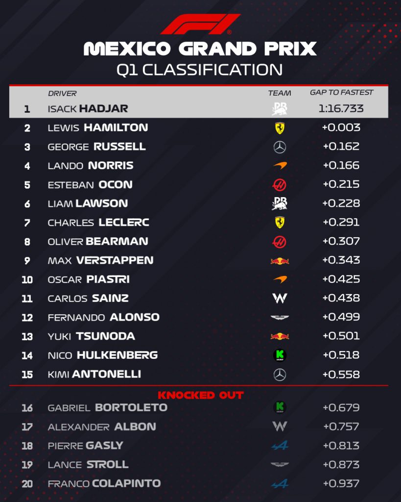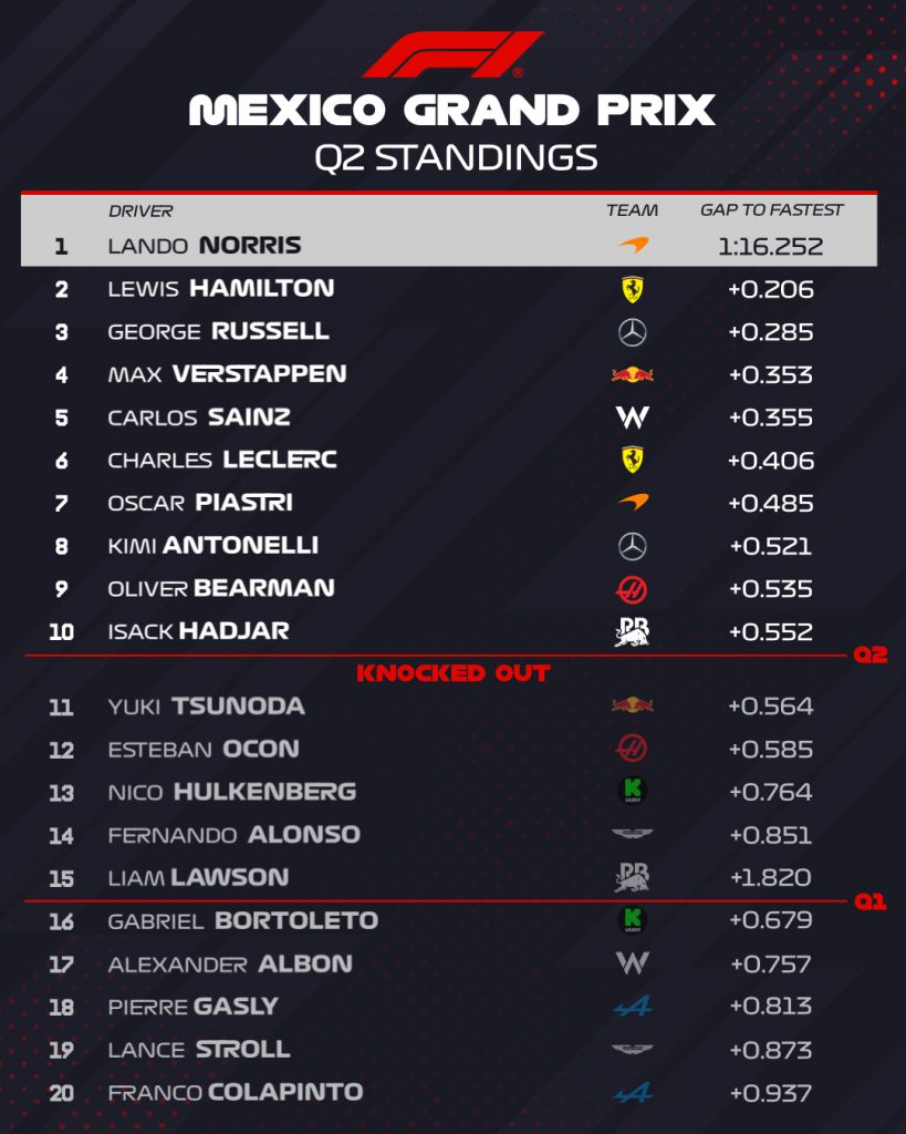 15:00 hora local, y daba inicio la clasificación del GP de México, apretada. Pese a a las dudas, el AMR25 de Alonso saldría a la Q1 tras un problema en la suspensión durante la FP3. La mayoría saldrían, quitando a los Red Bull, Carlos Sainz y ambos Mercedes. Norris se iba a la primera posición con un crono de 1:17.147, superando el mejor tiempo que pertenecía a Bearman.