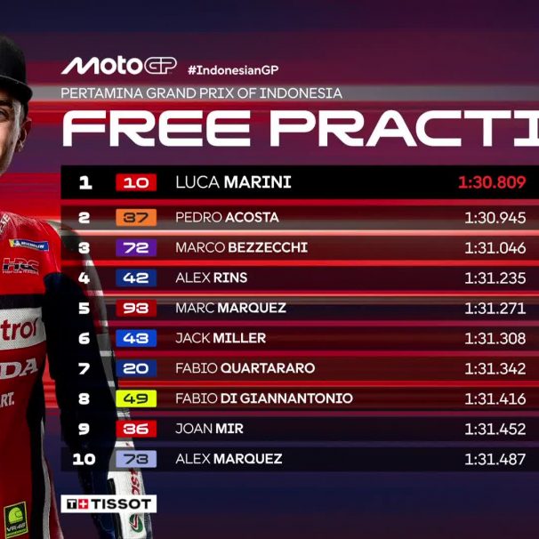 Comenzaban las motos a rugir en Indonesia, tras un fin de semana en Japón donde se decidió el título a favor de Marc Márquez. El primer tiempo de referencia lo dio Raúl Fernández (1:34.181). Rápidamente, Bezzecchi superó al español por dos décimas y en la siguiente vuelta, el propio piloto italiano rebajó su tiempo en siete décimas (1:31.831). Mientras tanto, Fermín Aldeguer se fue al suelo en la chicane de las curvas 7-8. A falta de media hora para el final, Marc se colocó primero por dos décimas y media (1:31.572). Por detrás, Johann Zarco se puso segundo, a la par que Márquez volvía a batir su propio registro en tres décimas (1:31.271).