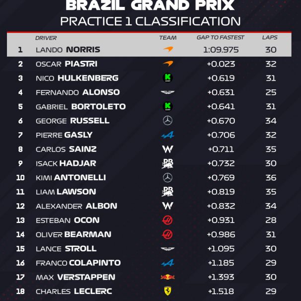 Con Norris primero, Piastri segundo y tercero Hülkenberg daba por finalizada la primera y única sesión de libres del fin de semana, con un orden que, salvo las 2 primeras posiciones, va a variar para la qualy sprint que más tarde acontecerá. P4 para el AMR25 de Fernando Alonso, P5 Gabriel Bortoleto en su primer Gran Premio de casa, P6 George Russell, P7 Pierre Gasly, P8 Carlos Sainz, P9 Isack Hadjar, P10 Andrea Kimi Antonelli. Para encontrar a ambos Red Bull y Ferrari hay que irnos a las 4 últimas posiciones de la tabla: P17 Max Verstappen que ni siquiera realizó las pruebas de salida en la recta de meta, P17 Charles Leclerc y P18 Lewis Hamilton, ambos sin haber pasado por los compuestos más blandos. El último a 1.7 de la cabeza es Yuki Tsunoda, que pudo rodar tras su incidente, pero no le ha servido de mucho.