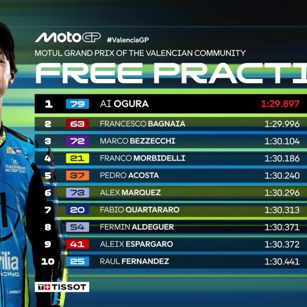 Finalmente, Ai Ogura cierra los últimos entrenamientos del año en primera posición, confirmando su buen estado de forma en las últimas carreras. Bagnaia, segundo, da esperanzas a que el italiano pueda cerrar una última ronda con buenos resultados. Por último, Bezzecchi cierra el top 3 de los resultados de los libres 2. Todo listo para la última clasificación del año, donde se le entregará las llaves del BMW M2 a Marc Márquez como recompensa a mejor clasificador.